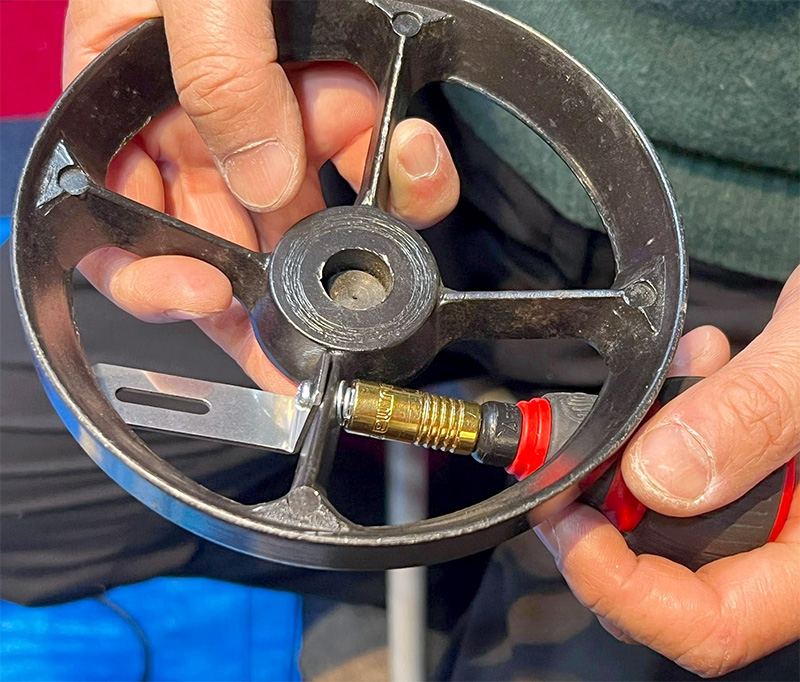 ヘッドを張る為のスポックス軸部分に穴を空けてボルトを通し
