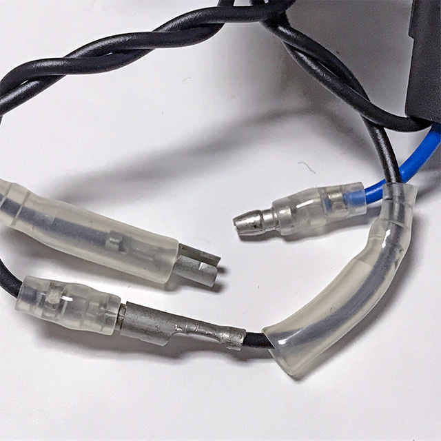 アウトが直結してあり子は、ホット配線にギボシ端子の♂端子、コールド配線に