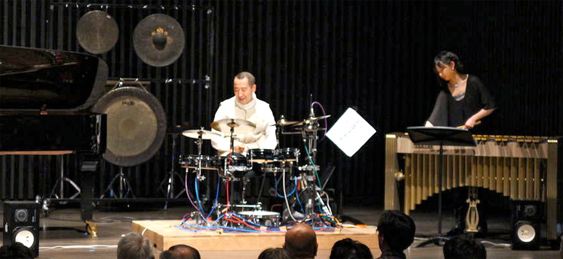 ハイリーズドラムセットを叩く私と、ビブラフォーンを演奏する冨岡さん。
