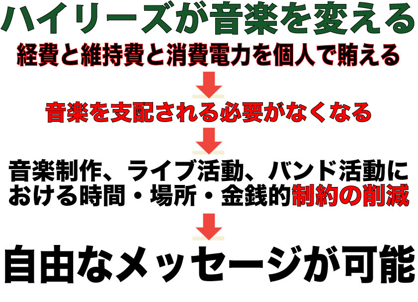 打楽器をエレキ化する事を以て、日本から新たな【音楽拡命】を起こすという志です! 現プロ達の音楽環境は【選ばれし才能ある者達のみが許され、そして味わえる贅沢な環境】であり、本来の音楽のあるべき姿は、音を楽しむという【万人が日常で楽しめる行為】であるべきだと思います。 そして必ず打楽器がリズムを刻むべきだし、ドラムこそが現代音楽のリズム楽器のメインです。 最近のデータに由ると、楽器を実際に奏でている人口は【楽器を演奏したい】人口の10分の1であり、その楽器比率はエレキギターが7,ベースが2,ドラムが1なのに、女子高生の一番やりたい楽器はドラムであるという統計も訊いております。 ドラムは、最もやりたい楽器でありながら、これだけやっている人が少ない最大の理由は【音がデカイ】【重たくて大きい】【電子ドラムは違和感がある】からであると思います。 又、CDから流れているドラムサウンドで、リバーブやEQ、コンプレッサー等、エフェクトの一切かかっていないドラムを聴いた事がありません。 ハイリーズは、全ての音楽家に調和を与え、ドラムサウンドに自由を与え、身近にバンド活動を実現出来る環境を提供できる最適な手段です。 ハイリーズは、 音楽を演奏する敷居を下げる『ハイリーズの音楽拡命』は、今迄の【贅沢な音楽環境】に取って代わるものでは決してありません。 音楽は、人の心を豊かにします。 音楽が一般家庭に拡大普及する事は、ゴスペルのような、賛美歌のような、ママさんコーラスの合唱のような、雅楽のような、お祭り太鼓や盆踊りのような、お寺のご詠歌のような、フォークソングの起源のような、ドラムサークルのような、庶民の日常に溶け込んだ習慣のような形で、音の光が魂を輝かし育くむ事に繋がり、世界を明るく照らす希望の光となる事でしょう。 本来の音楽は、神や仏に捧げ、人と人との中核にある己れ自身でもある【魂= Soul 】の共振を育む為の媒体でもあると思います。それは民族を超え、国家を超え、宗教を超えて、全ての存在に調和と平和と自由と平等と希望と勇気と愛を与える為の文化であり、人類に絶やしてはいけない、最も栄えるべき心の交流であるべき外交交渉とも言える平和活動であると信じます。 音楽はもっと庶民に身近であるべきです。 その為にも、ハイリーズが打楽器をエレキ化する事から、身近な音楽活動を盛んにしたいのです。それこそが私の夢であり、志であり、万人を幸せにできる希望であると信じます。 革命とは、命を革めると書きますが、もしそうならハイリーズは音楽に革命をもたらすのではなく、拡命としたいと考えます。 皆さん、もっと楽器に親しみましょうよ。 打楽器がハイリーズになれば、声が小さくても歌い手の歌詞はよく聞こえます。楽器の音が全員聞こえるようになります。 ハイリーズは、音楽を進化させるのです! これに由り、音楽人口、演奏人口が増加する事が、現在の贅沢な音楽環境を栄えさせる結果すら誘引すると信じております。 皆さんがハイリーズを所有して、日々の暮らしの中に音楽を導入して欲しい、気軽に音楽を奏でて欲しいのです。皆さんの参加を、心の底から待っております! 株式会社ハイリーズ 代表取締役 ともだしんご |