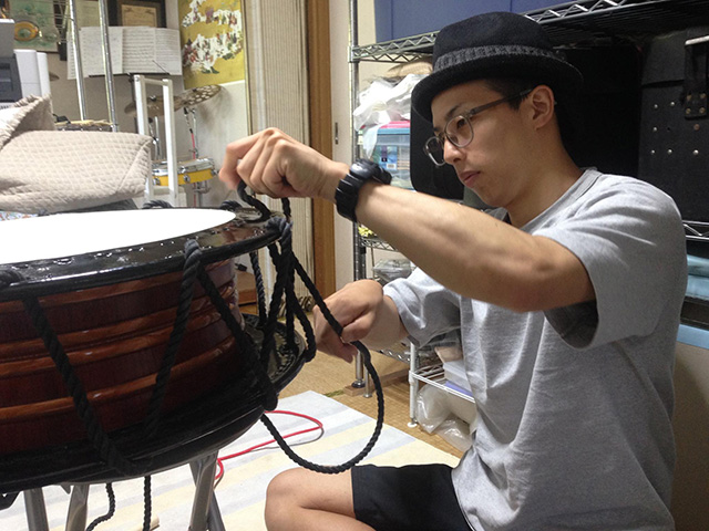 自作寿司桶太鼓の締め縄を素早く解く恵風氏